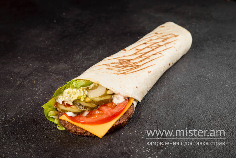 запечена тортилья, подвійна соковита яловича котлета, сир "Чеддер", томат, маринований огірочок і цибуля, салат Айсберг, соуси Американський та BBQ