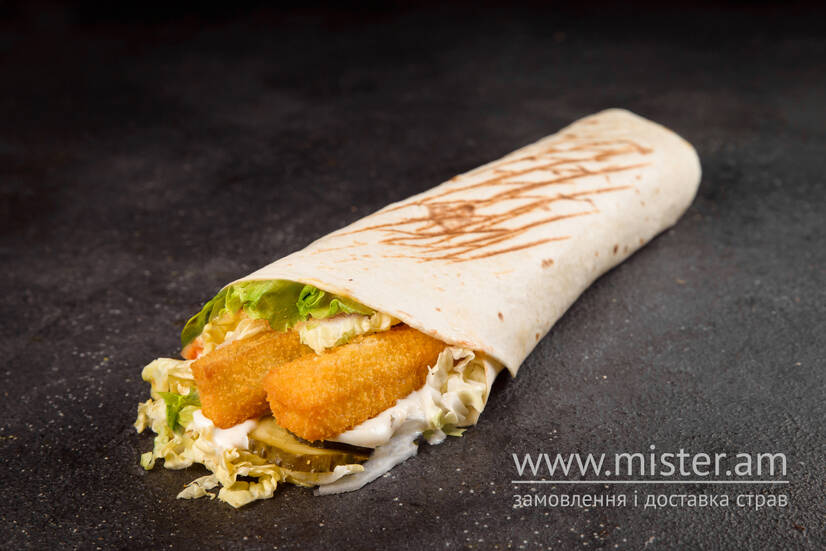 запечена тортилья, апетитні рибні палички в паніровці, маринований огірочок і цибуля, сир Гауда, салат Айсберг, соус Часниковий