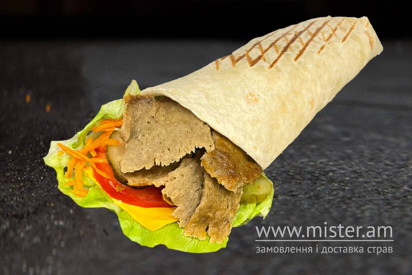 запечена тортилья, донер кебеб яловичий, маринований огірочок, томат, сир Чедер, корейська морква, свіжа цибуля, листя айсбергу та фірмовий соус з часником