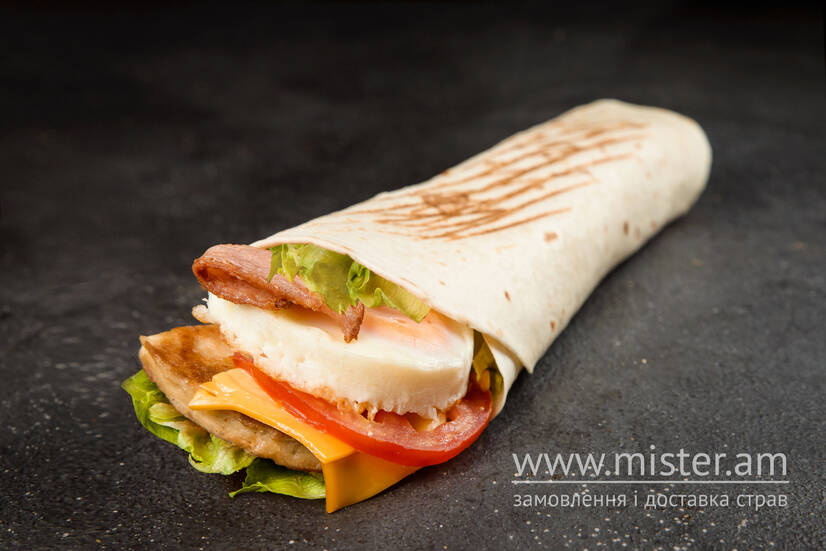 запечена тортилья, подвійна яєчня, ніжна куряча котлета, підсмажений бекон, сир "Чеддер", томат, фірмова намазанка з Фети