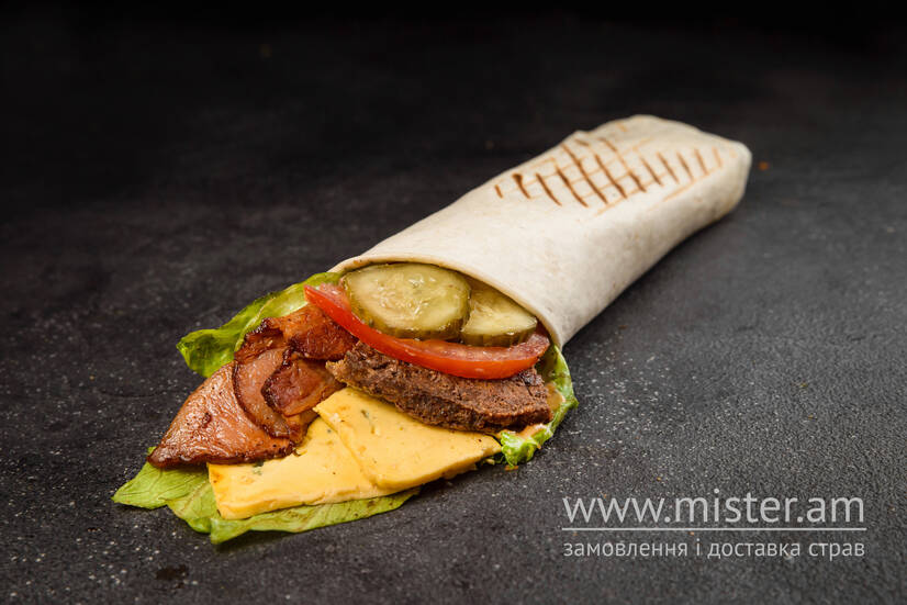 запечена тортилья, соковита яловича котлета, підсмажений подвійний бекон, сир Лазур з пліснявою, томат, маринований огірочок, салат Айсберг, соус бургерний