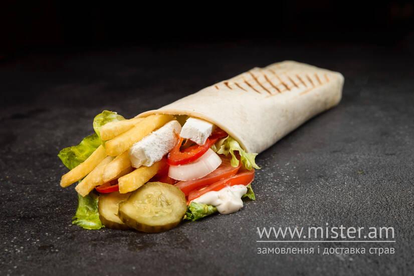 запечена тортилья, томат, болгарський перець, сир “Фета”, картопля фрі, маринований огірочок і цибуля, салат Айсберг, соус часниковий