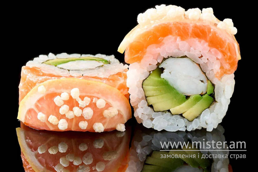Рис, тигрові креветки, лосось, авокадо, лимон, рисові кульки.