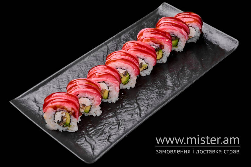 Рис, крем-сир, авокадо, вугор, ікра тобіко, тунець.