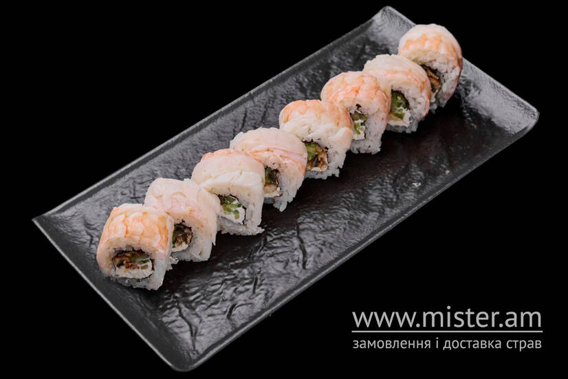 Рис, крем-сир, огірки, тигрова креветка, ікра тобіко, вугор.