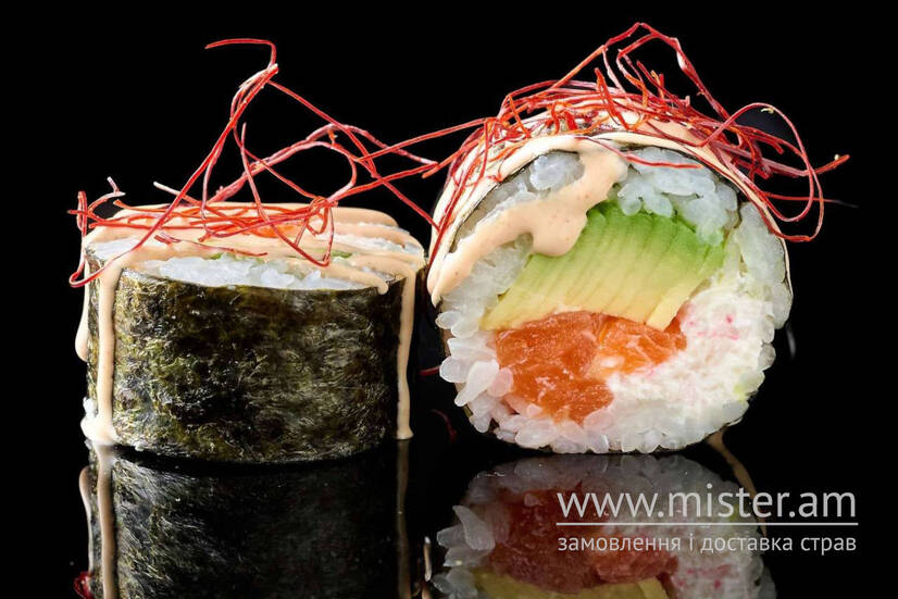Рис, лосось, авокадо, крем сир, сурімі, срус спайсі.