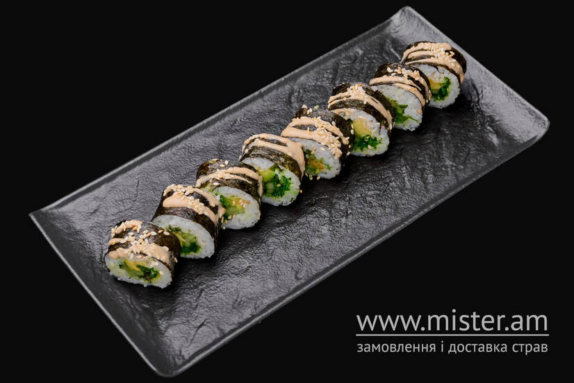 Рис, чука, огірок, авокадо, горіховий соус, кунжут.