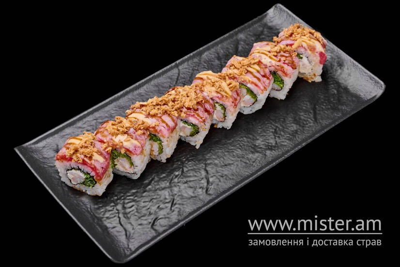 Рис, лосось, листя салату, крем-сир, тигрова креветка, понзу.