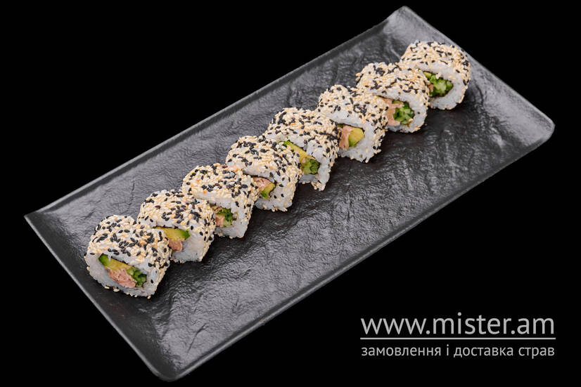 Рис, лосось гриль, ікра тобіко. кунжут, огірок, авокадо, японський майонез.