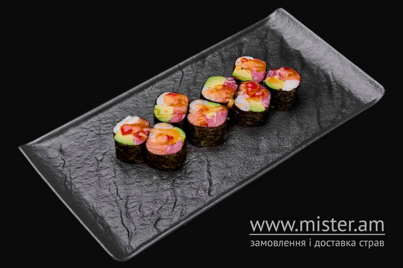 Тигрова креветка, лосось, тунець, авокадо, тайський соус.