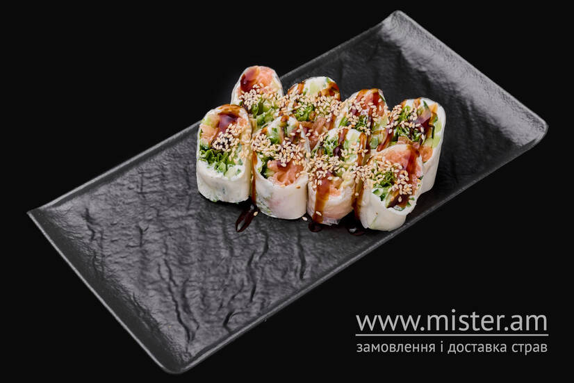 Рисовий папір, лосось, авокадо, огірки, крем сир, соус понзу, кунжут.