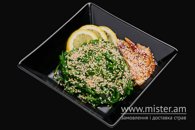 Водорості чука, горіховий соус, кунжут, вугор, унагі соус.