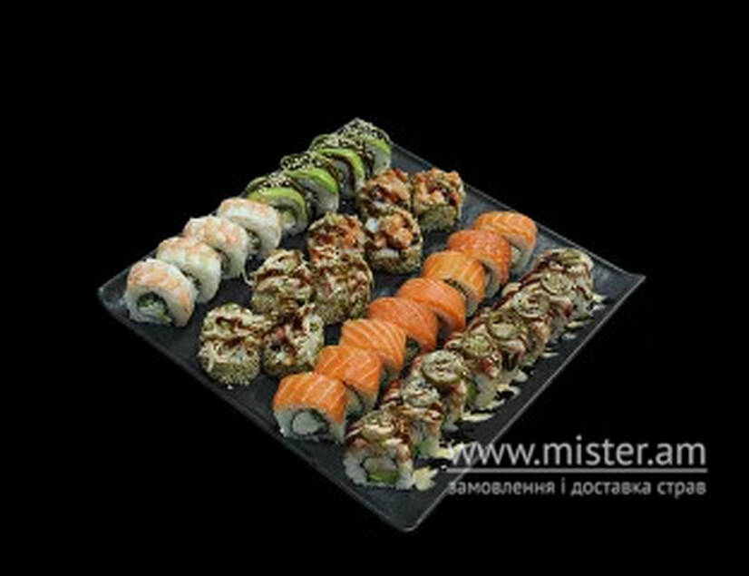 філадельфія з лососем, пікантний тартар, золотий дракон½ , зелений дракон½, спайсі з лососем½, спайсі з сурімі½, 1090 г ( 32 шм
