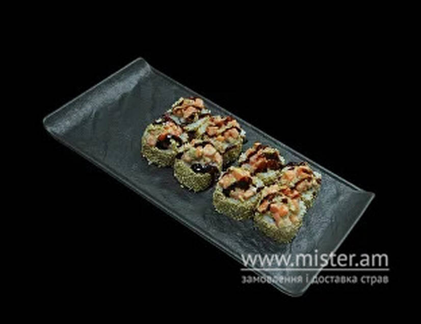 Рис, норі, огірок, сурімі, тартар з лосося з халапеньйо, кунжут, унагі соус, соус шрірача,