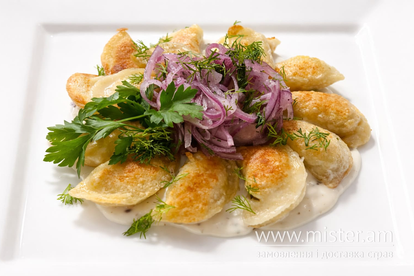 Вареники смажені з картоплею та цибулевим соусом