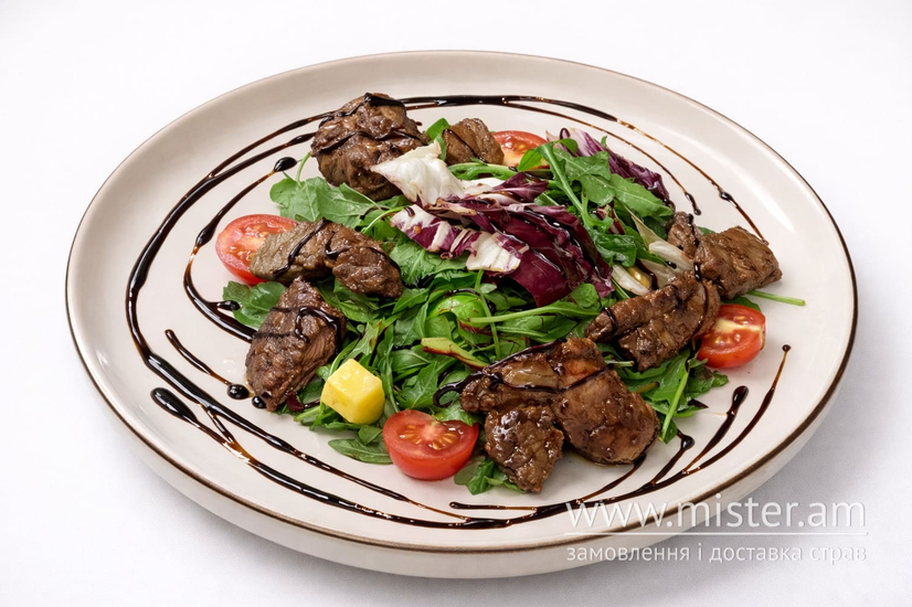 Мікс салатів, ананас консервований, печінка куряча, помідори чері.