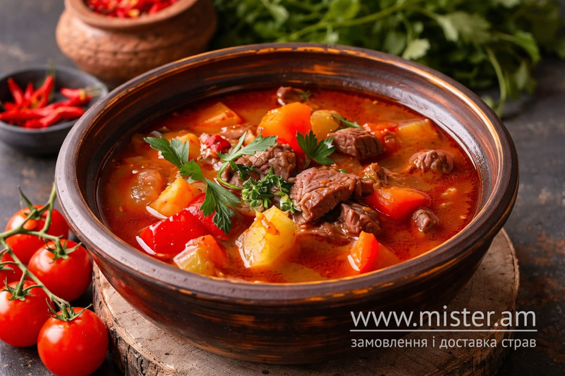 Телятина, копчені мисливські ковбаски, перець болгарський, картопля, морква, цибуля, перець чілі.