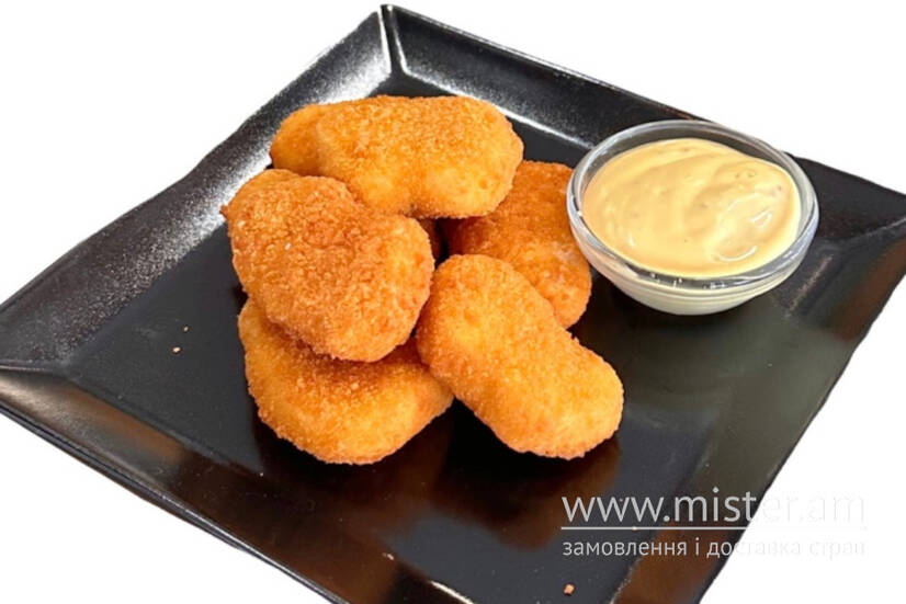 Курячі крила в соусі тайському з кунжутом, подається з сирною мазанкою.