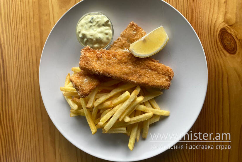 Хек смажений у фритюрі з картоплею фрі, подається з лимоном та соусом тартар.