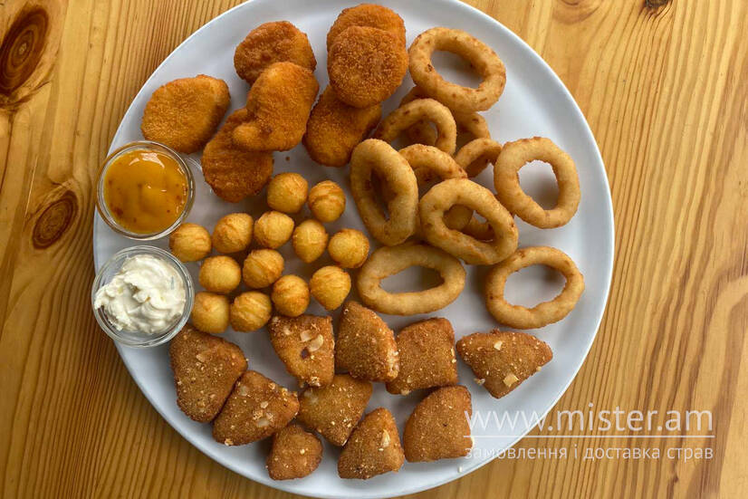 Сир у фритюрі, кільця цибулеві, нагетси, картопляні крокети. Соус до бургера, соус сирний, пікантний
