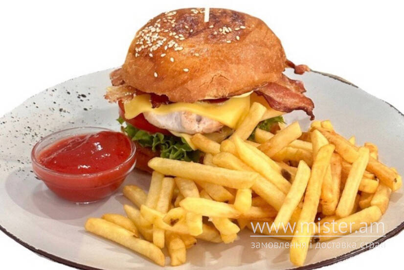 Куряче філе, бекон, картопля печена, сирний соус, цибуля синя, томати чері, кінза.