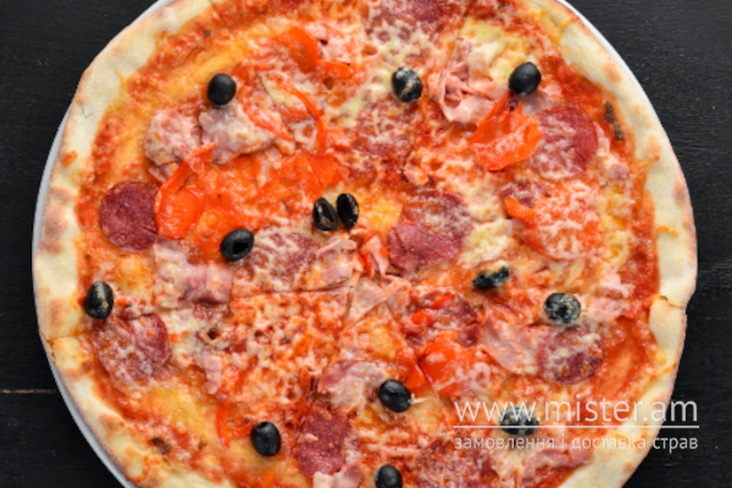Томатний соус, моцарела, бекон, салямі, шинка, оливки, болгарський перець.