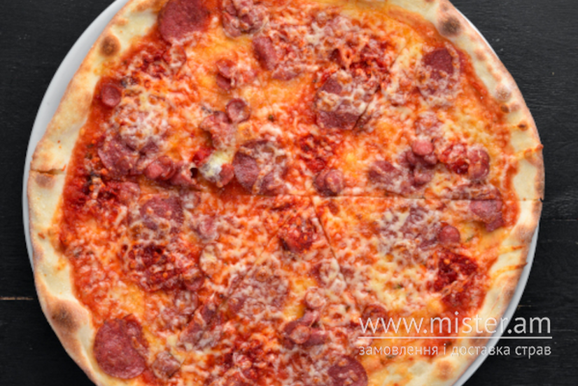 Томатний соус, моцарела, салямі, мисливські ковбаски, перець чилі.