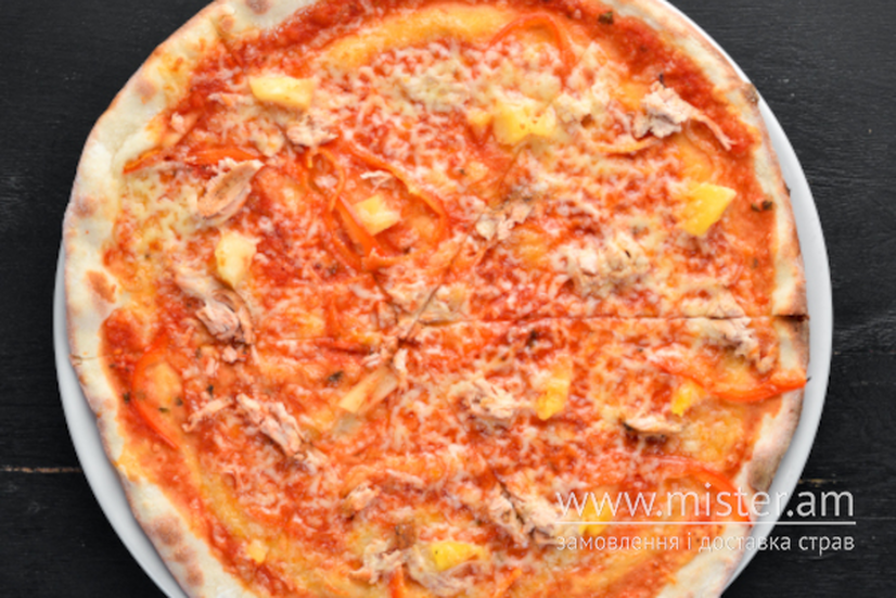 Томатний соус, моцарела, болгарський перець, курка, ананас.