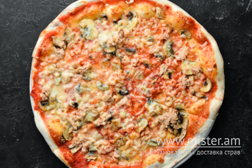Томатний соус, моцарела, креветки, тунець, печериці