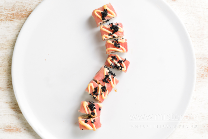 Рис, норі, крем сир, огірок, тунець, соус спайсі, ікра тобіко.