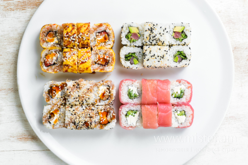 Сирний з вугрем, філадельфія маруго, каліфорнія з тунцем, каліфорнія з вугрем та сиром.
