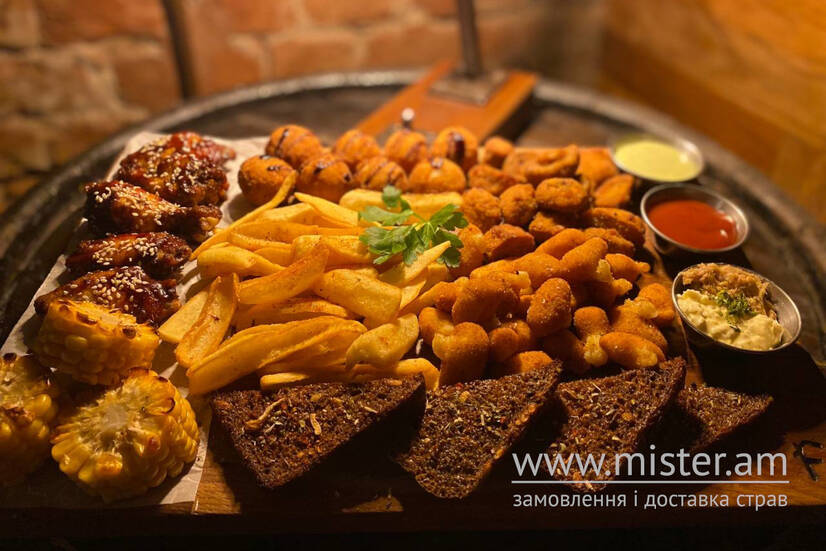 Курячі крильця у медово-томатному соусі, кукурудза, картопляні крокети, картопляні діпи, курячі кульки, грибочки фрі, запечені грінки, соуси.
