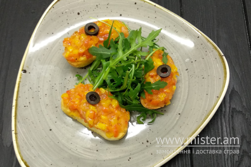 Гуакамоле, помідор чері, кінза, оливки, цибуля кранч, рукола, нитки чилі, рисовий папір.