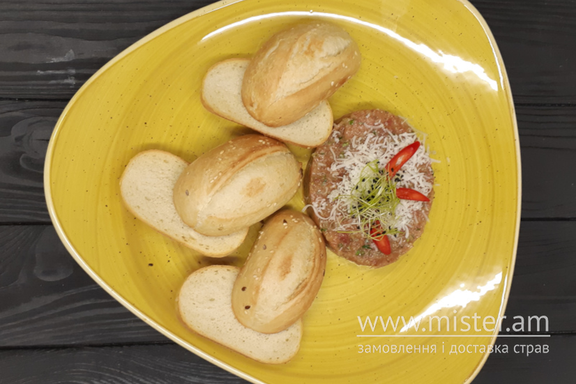 Телятина, гуакамоле, трюфельний соус, яйце перепелине, в‘ялені томати, петрушка, каперси плодоніжка, нитки чилі, папір рисовий, мікрогрін.