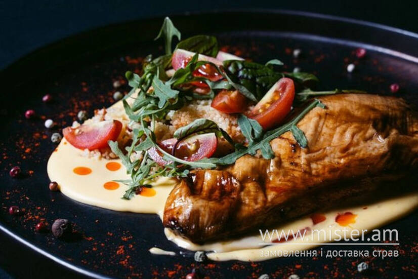 Куряче філе, кус-кус, пармезан, в'ялені томати, соус Голандез, рукола, помідор чері, паприка копчена, соус унагі.