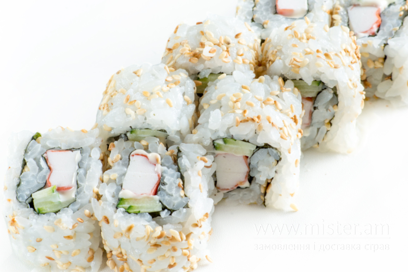 Сніжний краб, огірок, сир вершковий, ікра корюшки, соус діп.