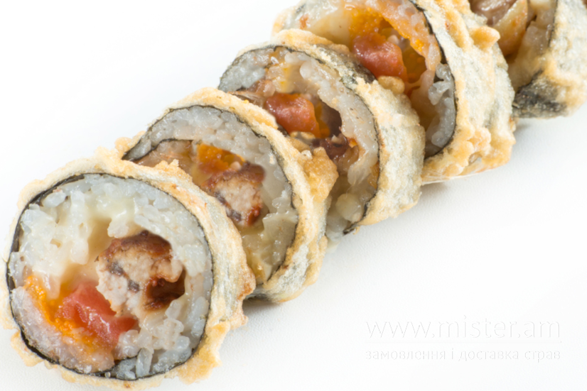 Вугор, сир моцарела, сир гауда, ікра корюшки, японський гострий майонез, унагі соус.