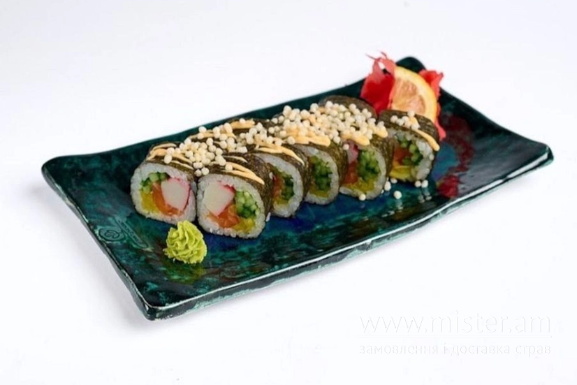 норі,рис,огірок,лосось,сніжний краб,майонез японський гострий,дайкон,рисові кульки