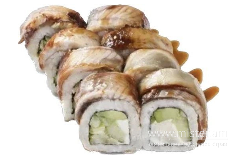 Вугор, огірок, сир вершковий, авокадо, унагі соус.