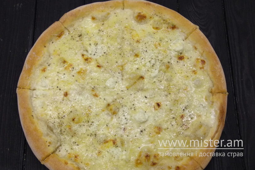 Тісто, соус бешамель, сир моцарела, сир гауда, сир дор блю, сир пармезан.