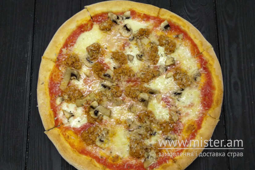 Тісто, соус томатний, сир моцарела, печериці, соус м’ясний болоньєзе, сир пармезан.