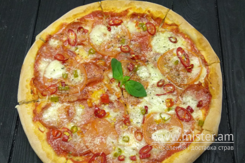 Тісто, соус томатний, сир моцарела, салямі папероні, перець пепероні маринований гострий, томати, перець чилі, сир пармезан.