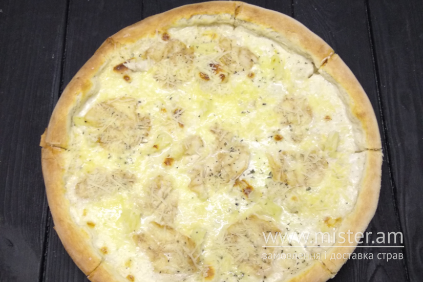 Тісто, соус бешамель, сир моцарела, ананас консервований, куряче філе, сир пармезан.