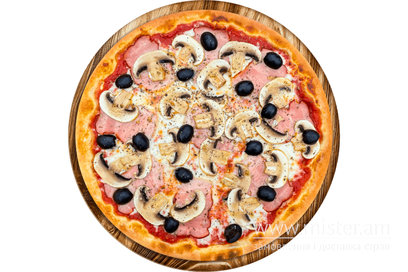 Тісто, соус томатний, моцарелла, томат, шинка, печериці, пармезан, оливки чорні.