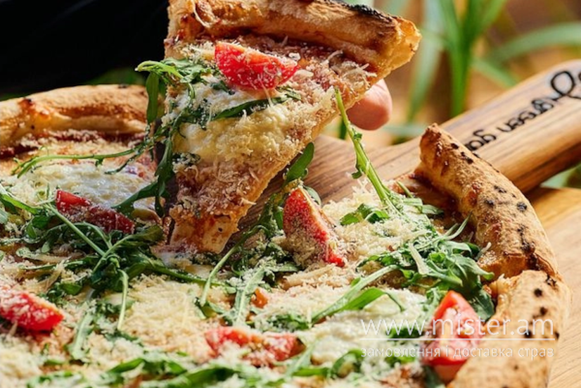 Тісто, соус томатний, сир моцарела, помідор чері, шинка, страчателла, салат рукола, сир пармезан.