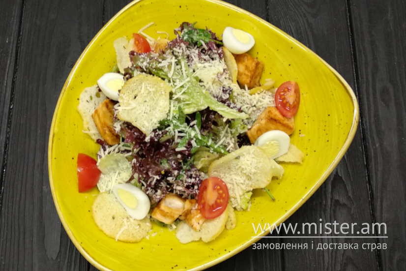 Філе лосося, заправка цезар, мікс салатів, крутони, сир пармезан, помідор чері, перепелине яйце.