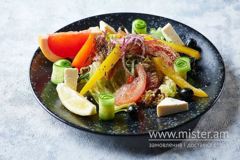 Помідор, огірок, перець болгарський, синя цибуля, мікс салатів,оливкова олія, сир фета, оливки, спеції, лимон, грейпфрут.