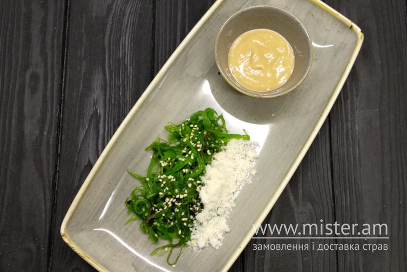 Водорості хіяші вакаме, кунжут, горіховий соус, рисові чипси.
