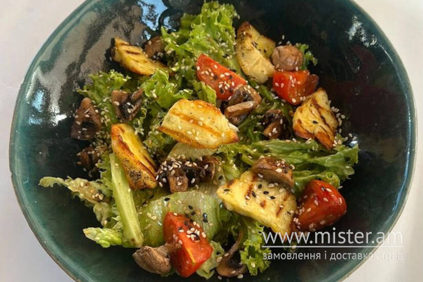 Мікс салату, сир халумі, соус вінігрет, помідор, печериці, кунжут.