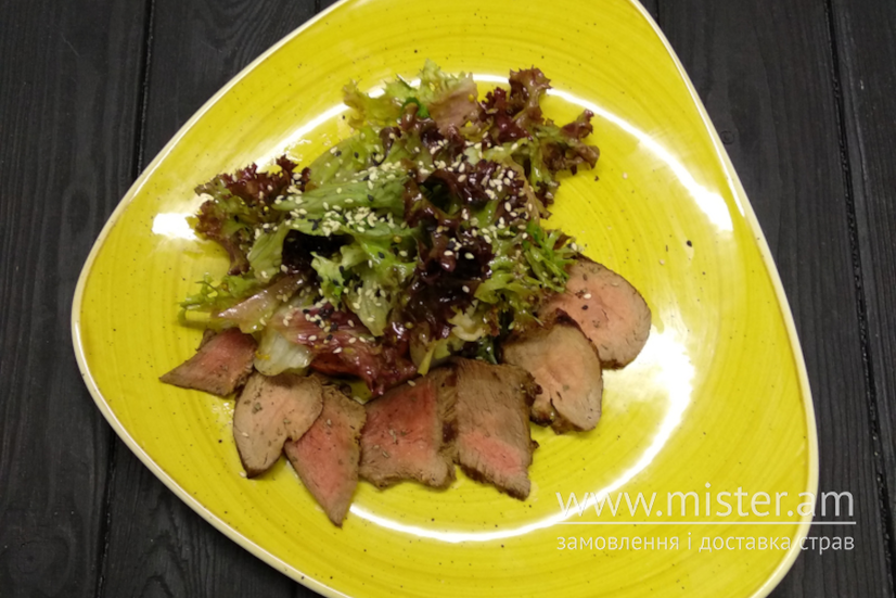 Телятина, помідор чері, цукіні, мікс салатів, печериці, перець болгарський, соус вінегрет, кунжут, спеції.